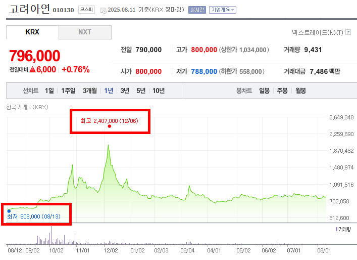 - 요약하자면, 고려아연 주가는 2024년 8~9월 하락 후 10월부터 12월까지 급격한 상승세를 기록했으며, 이후에는 조정 국면을 거쳐 안정권에 들어섰다. 이러한 패턴은 산업 성장성과 기업 경쟁력에 대한 기대가 주가에 큰 영향을 미쳤음을 보여준다.