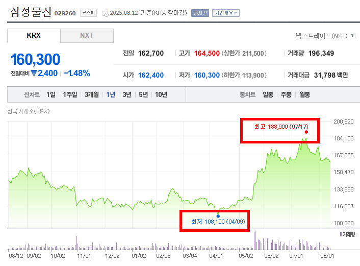 • 먼저 하락 구간을 보면, 2024년 8월 중순부터 2025년 4월 9일까지 주가는 전체적으로 약세를 보였다. 특히 4월 9일에는 최저점인 108,100원까지 떨어졌는데, 이 시기에는 국내외 경기 불확실성과 원자재 가격 변동, 그리고 건설 및 상사 부문에서의 경기 둔화 우려가 복합적으로 작용한 것으로 판단된다.