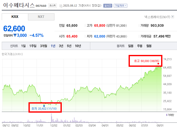 이수페타시스 주가 52주 변화