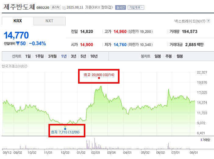 제주반도체 주가 52주 변화
