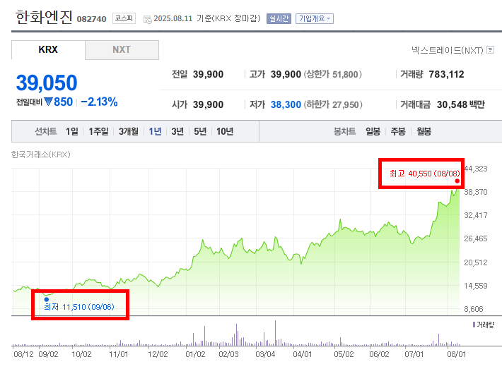 - 그다음 상승 구간은 2024년 9월 이후부터 2025년 8월 초까지 이어졌다. 9월 최저점 이후 주가는 꾸준히 반등하며 상승세로 돌아섰고, 특히 2025년 8월 8일에는 최고가 40,550원까지 올랐다. 이 기간 동안 주가는 약 3.5배 가까이 상승한 셈이다. 상승 요인으로는 조선업 호황과 함께 한화엔진이 조선 관련 기술과 프로젝트에서 긍정적인 성과를 내면서 투자자들의 신뢰가 회복된 것으로 보인다. 또한, 정부의 산업 육성 정책과 기술 발전 기대감도 주가에 긍정적으로 작용했다.