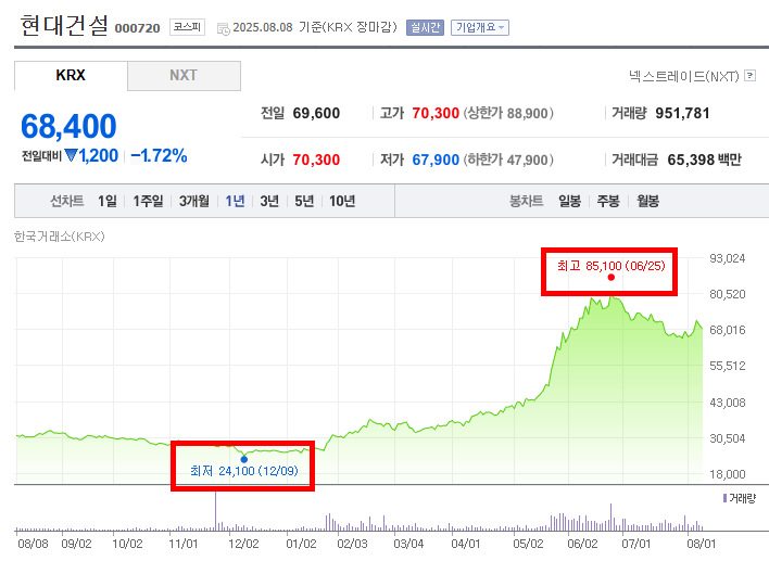 • 그 뒤부터는 본격적인 상승 국면이 펼쳐졌다. 2025년 1월부터 주가가 꾸준히 상승하기 시작해 6월 25일에는 최고점인 85,100원까지 올랐다. 이 상승은 작년 4분기 부실 털어내기 이후 수익성 개선 기대감과 저금리 환경, 그리고 도시정비 수주 증가 등 건설 분야 긍정적 이슈가 복합적으로 반영된 결과로 보인다. 특히 부산 지역 신규 아파트 분양 같은 성장 가능성 높은 사업들이 투자자들의 관심을 끌면서 주가를 밀어올렸다.