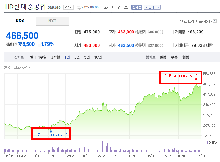 - 반면, 2025년 1월부터 상승세가 본격화했다. 1월부터는 글로벌 친환경 선박 수요 증가와, LNG 관련 수주 호조, 그리고 신조선가 상승 기대감이 도움되면서 주가가 뚜렷이 올랐다. 6월 말부터 7월 말까지는 특히 힘이 실려서 7월 31일에는 최고점 513,000원까지 찍었다. 이 시기에는 2분기 실적 개선 발표와 함께, 해운·조선 경기 호전 전망이 투자 심리를 크게 끌어올린 결과라고 할 수 있다.